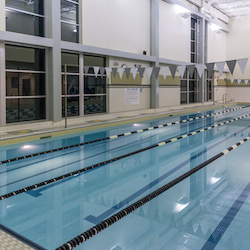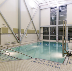 Our beautiful aquatic area has a spacious, open design with two pools. The lap pool offers four lanes, 25 yards in length, with a depth range from 3.5’ to 7’. The water temperature is kept at a comfortable 82˚